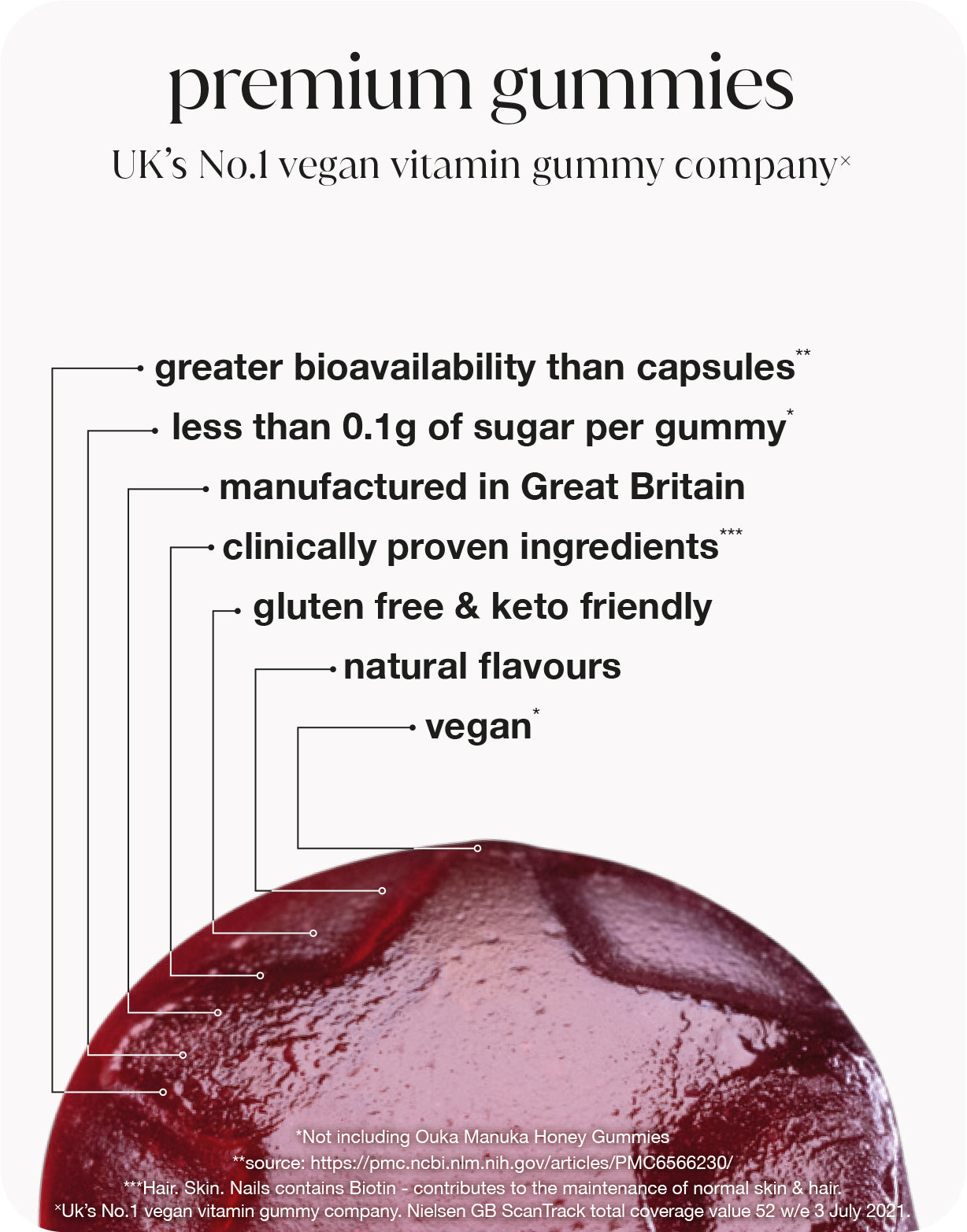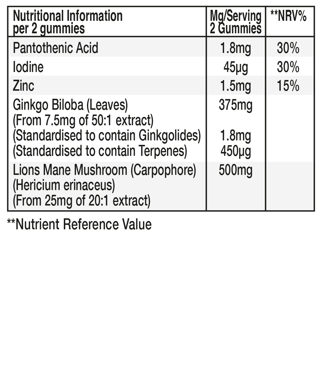 Sweeteners (Maltitol Syrup, Isomalt, Xylitol, Sorbitol, Erythritol, Steviol Glycosides from Stevia), Gelling Agent (Citrus Pectin), Acid (Citric acid), Natural Flavouring, Colour (Spirulina Concentrate, Black Carrot Juice Concentrate), Citrus Fibre, Lion’s Mane Mushroom Extract, Acidity Regulator (Sodium Citrate), Medium Chain Triglycerides, Ginkgo Biloba Extract, Glaze (Coconut Oil, Rapeseed Oil, Glazing Agent: Carnauba Wax), Zinc Citrate, Calcium D-Pantothenate, Potassium Iodide.