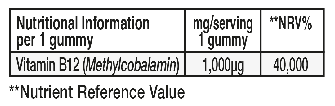 Each delicious Vit-B12 gummy contains a generous 1000μg per serving and offers clinically proven health benefits. Vitamin B12 is known to contribute to reduction of tiredness, fatigue and cell division as well as normal neurological & psychological functions & homocysteine metabolism. This means taking Starpowa's Vit-B12 in the morning as part of your daily routine can support your energy levels throughout the day.
