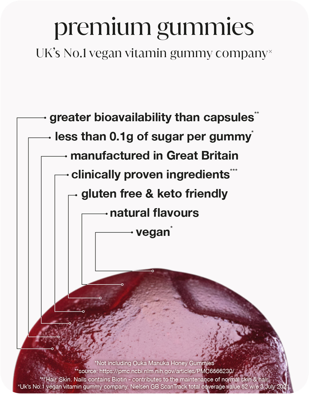 We are not like your regular gummy filled with sugar and gelatine. Each gummy contains less than 0.1 grams of sugar. We use natural sweeteners to create the healthiest gummy possible.