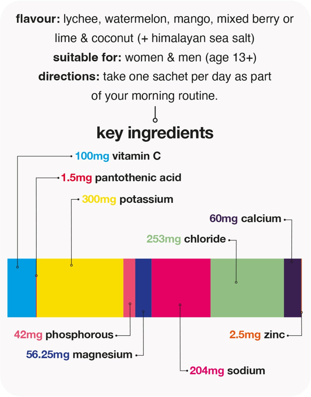 watermelon ingredients: Acids (Citric Acid, Malic Acid), Natural Flavouring, Sodium Citrate, Magnesium Citrate, Dipotassium Phosphate, Potassium Chloride, Calcium Carbonate, Himalayan Pink Salt, Potassium Citrate, Calcium Ascorbate, Salt (Sodium Chloride), Anti-caking Agent (Silicon Dioxide), Sweetener (Steviol Glycosides from Stevia), Zinc Citrate, Calcium D-Pantothenate, Colours (Curcumin, Beetroot Red), Chromium Picolinate, Methylcobalamin. lychee ingredients: Acids (Citric Acid, Malic Acid), Sodium Citrate, Magnesium Citrate, Potassium Chloride, Dipotassium Phosphate, Calcium Carbonate, Himalayan salt, Potassium Citrate, Calcium Ascorbate, Salt (Sodium Chloride), Anti-caking Agent (Silicon Dioxide), Sweetener (Steviol Glycosides from Stevia), Natural Flavouring, Zinc Citrate, Calcium D-Pantothenate, Colours (Curcumin, Beetroot Red), Chromium Picolinate, Methylcobalamin. mango ingredients: Acids (Citric Acid, Malic Acid), Natural Flavouring, Sodium Citrate, Dipotassium Phosphate, Potassium Chloride, Magnesium Citrate, Calcium Carbonate, Himalayan salt, Potassium Citrate, Calcium Ascorbate, Salt (Sodium Chloride), Sweetener (Steviol Glycosides from Stevia), Anti-caking Agent (Silicon Dioxide), Zinc Citrate, Colours (Curcumin, Beetroot Red), Calcium D-Pantothenate, Chromium Picolinate, Methylcobalamin. mixed berry ingredients: Acids (Citric Acid, Malic Acid), Sodium Citrate, Magnesium Citrate, Potassium Chloride, Dipotassium Phosphate, Calcium Carbonate, Himalayan salt, Potassium Citrate, Calcium Ascorbate, Salt (Sodium Chloride), Anti-caking Agent (Silicon Dioxide), Sweetener (Steviol Glycosides from Stevia), Natural Flavourings, Zinc Citrate, Calcium D-Pantothenate, Colours (Curcumin, Beetroot Red), Chromium Picolinate, Methylcobalamin. lime + coconut ingredients: Acids (Citric Acid, Malic Acid), Lime Juice Powder, Sodium Citrate, Magnesium Citrate, Potassium Chloride, Dipotassium Phosphate, Natural Flavouring, Calcium Carbonate, Himalayan salt, Potassium Citrate, Calcium Ascorbate, Salt (Sodium Chloride), Anti-caking Agent (Silicon Dioxide), Sweetener (Steviol Glycosides from Stevia), Zinc Citrate, Calcium D-Pantothenate, Colour (Copper complexes of Chlorophyllin), Chromium Picolinate, Methylcobalamin.