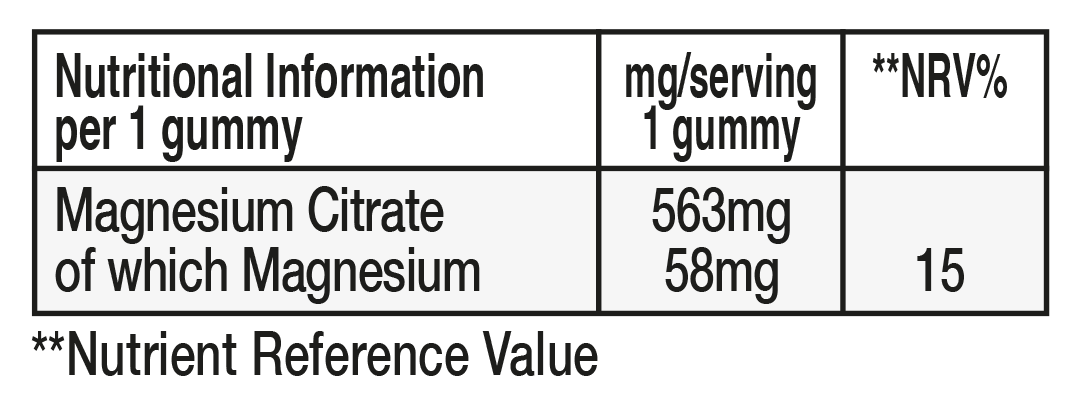 Sweeteners (Maltitol Syrup, Erythritol, Sorbitol), Magnesium Citrate Nonahydrate, Acidity Regulators (Citric Acid, Trisodium Citrate), Gelling Agent (Pectin), Natural Strawberry Flavouring, Black Carrot Juice Concentrate.