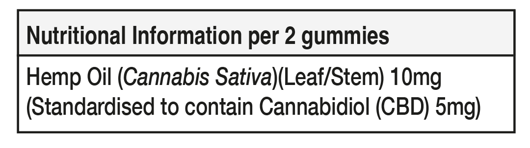 Sweeteners (Maltitol Syrup, Isomalt, Xylitol, Sorbitol, Erythritol), Citrus Pectin, Natural Apple Flavouring, Colours (Spirulina Extract, Safflower Extract), Acid (Citric Acid), Glaze (Extra Virgin Olive Oil, Coconut Oil, Rapeseed Oil, Glazing Agent Carnauba Wax), Hemp Oil (Cannabis Sativa), Acidity Regulators (Potassium Citrate, Sodium Citrate).