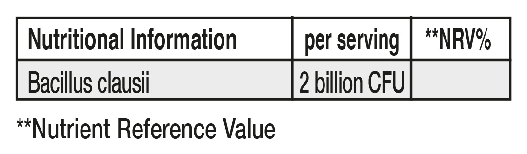 Bacillus clausii, Encapsulating/Emulsifying Agent (Lecithin- GMO free Sunflower), Sweetener/Prebiotic (Xylo oligosaccharides), Thickening/Gelling Agents (Guar Gum, Gum Acacia), Bulking/Humectant Agent (Glycerol), Flavours/Natural Flavouring Agents (Vanilla Extract, Cinnamon Extract, Mango Flavour), Acidity Regulator (Citric Acid), and Solvent/Diluent (Water)